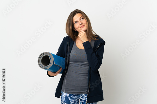 © luismolinero, Fototapeta premium Slovak girl going to yoga classes isolated on white background and looking up