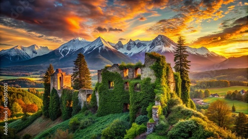 © prapatsorn, Fototapeta premium Slovakia Double Exposure: Majestic Tatras Mountains Overlapping Ancient Castle Ruins