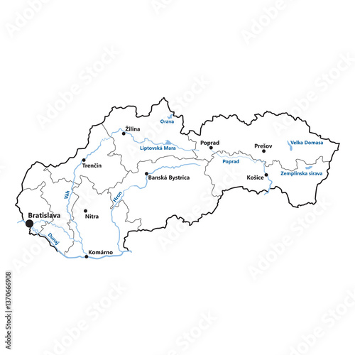 Obraz premium Slovakia map with regions, waterways, cities and namings