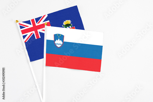 © sezerozger, Naklejka premium Slovenia and Cayman Islands stick flags on white background. High quality fabric, miniature national flag. Peaceful global concept.White floor for copy space.