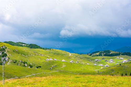 Fototapeta premium Slovenia velika planina (big plateau), agriculture pasture land near city Kamnik in Slovenian Alps. Wooden houses on green land used by herdsmen. Mountain village with big pasture plateau.