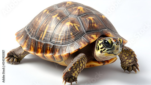 Obraz premium Slow pet turtle or wild tortoise reptile walking with its cute shell isolated on a white background