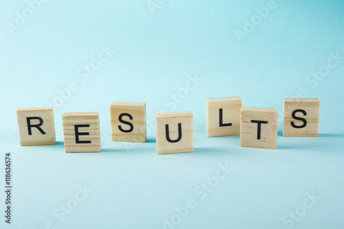 © projectio, Obraz premium Słowo wyników na niebiesko. Odnieś sukces biznesowy, bądź zwycięzcą w wyborach, sondażach lub testach sportowych, raportach, wynikach wyborów. Liczenie strat i zysków, analiza statystyki finansowej