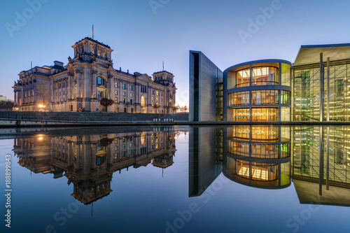 © elxeneize, Fototapeta premium Słynny Reichtsag i Paul-Loebe-Haus nad Szprewą w Berlinie o świcie