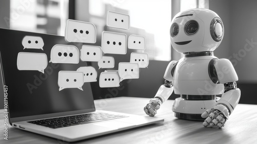 © leszekglasner, Fototapeta premium Small AI assistant chatbot stands next to a laptop and waits for prompts to help with work