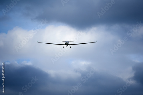 © Jan, Fototapeta premium Small aircraft on landing approach. Dramatic sky with blue gray clouds. Front view.
