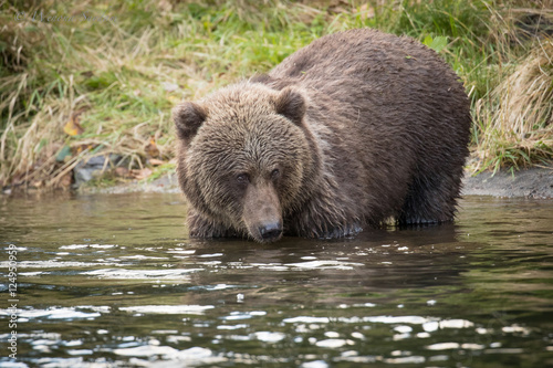 © Wenona Suydam, Obraz premium Small Alaskan Grizzly Bear standing in water with butt in air.