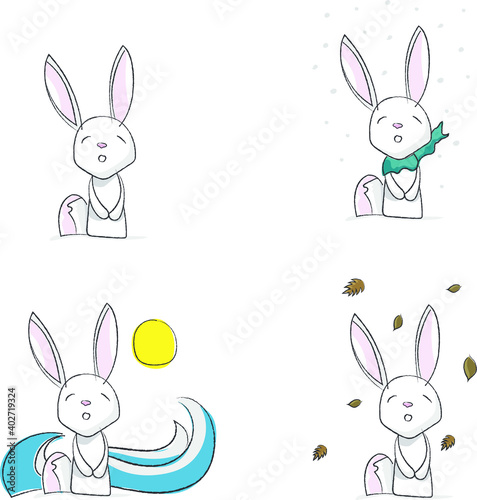 Fototapeta premium Small and cute illustrated rabbit. Rabbit made in vector with bright colors. Rabbit set with snow, sun and sea.