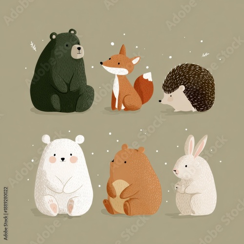 © Anat art, Fototapeta premium Small animals including a bear, fox, hedgehog, and rabbit are illustrated in a simple style on a neutral background.