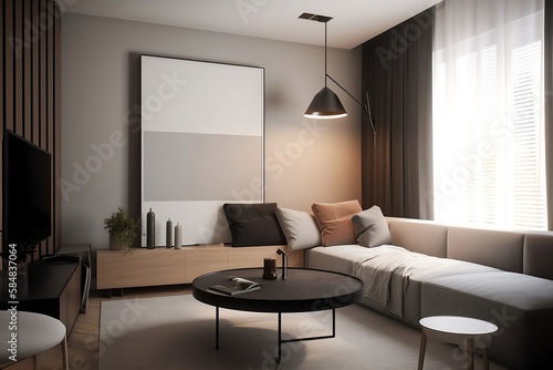 © Vladislav, Fototapeta premium small appartment modern living room interior with table sofa curtains couch