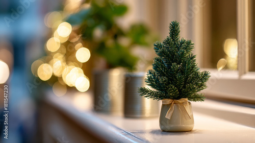 © Anastasiya Marchenko, Fototapeta premium Small artificial Christmas tree in a decorative pot with a bow on a windowsill with blurred festive lights in the background