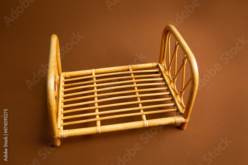 Fototapeta premium small bamboo bed. crib for a newborn photo shoot. Children's bed. bed for dolls