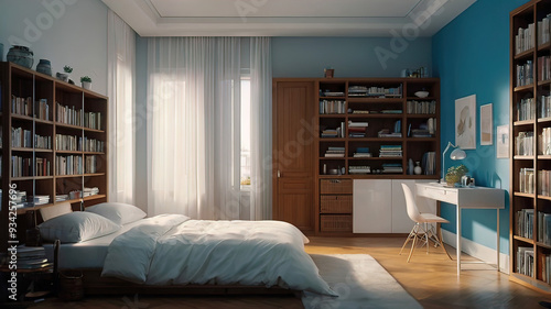 Fototapeta premium small bedroom with a white bed, under which there are storage drawers and a bookcase