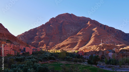 © Timon, Fototapeta premium Small Berber village near Tinghir, Morocco at the entrance of famous Todgha Gorges in the Altas Mountains with red colored rocks in the morning sun.