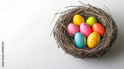 Fototapeta premium small bird nest containing vibrant eggs displayed on smooth white background