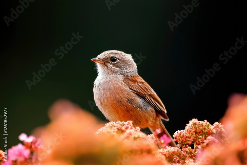 © Outkast, Fototapeta premium Small bird on flowers, eye level, blurred background, birdwatching guide content