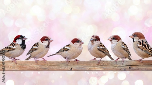 Fototapeta premium Small birds perched on a wooden fence display various expressions in a soft,...