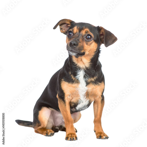 © TransPicHub, Obraz premium Small black and tan dog sitting upright with alert expression and perked ears.
