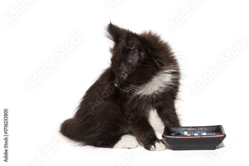 © Okssi, Obraz premium Small black kitten near a bowl of milk.