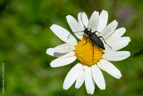 © Mathias Putze, Obraz premium small black longhorn beetle (stenurella nigra) feeding pollen on chamomile