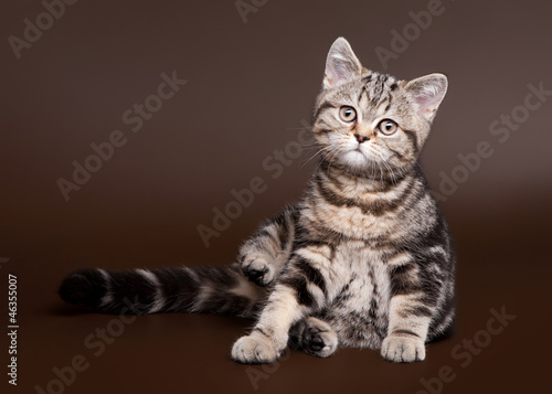© dionoanomalia, Obraz premium small black marble british kitten on dark brown background