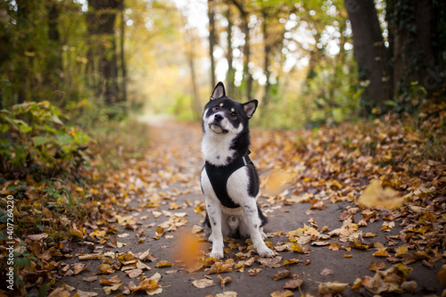 © lichtflut_photo, Fototapeta premium Small black shiba inu in the forest. Dog at the walk. Japanes dog sitting in the nature with flying leaves