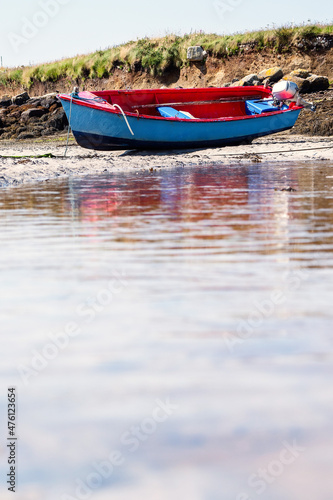 © mark_gusev, Naklejka premium Small blue color fishing boat with red painted interior on a sandy beach at low tide. Food supply chain industry.