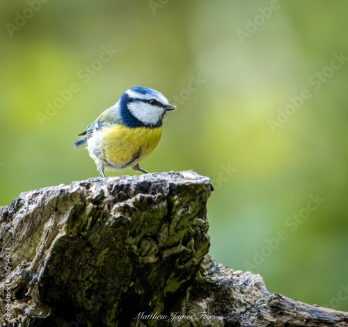 © Matthew Fox/Wirestock Creators, Obraz premium Small blue tit bird perched atop a stump