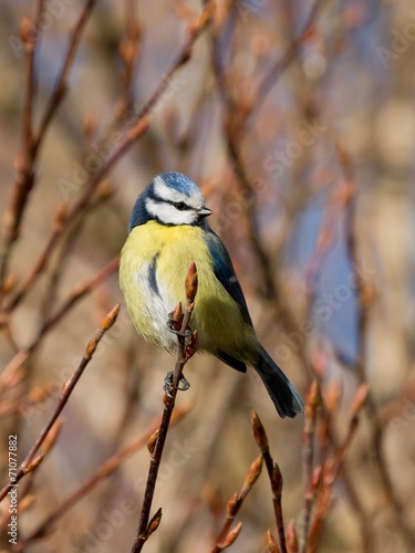 © JGade, Fototapeta premium Small blue tit perched on a twig in a bush