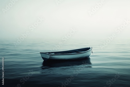 © Pixel Chaser , Naklejka premium Small Boat Adrift in Empty Ocean with No Nearby Land or Human Presence
