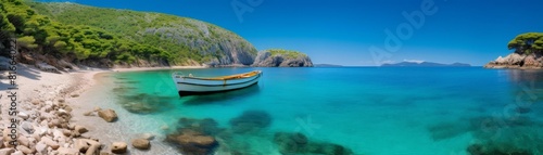 Obraz premium Small boat anchored in a beautiful bay with crystal clear water.