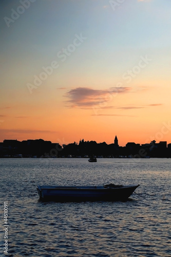 © jelena990, Naklejka premium Small boat and beautiful sunset over Stobrec, Croatia.