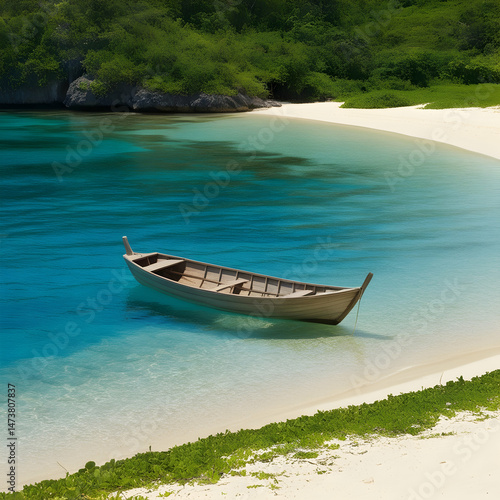 © I am images creator, Naklejka premium Small Boat Floating Calmly on Tranquil Water Surface