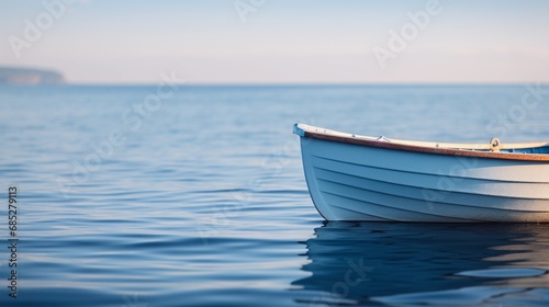 © betterpick|Art, Naklejka premium Small Boat Floating on the Quiet Sea with Horizon in View
