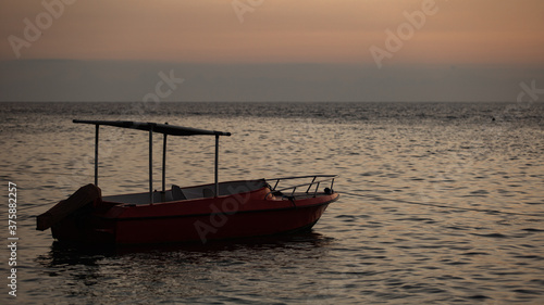 © alexzhilkin, Fototapeta premium small boat floats on the water against the background of mountains