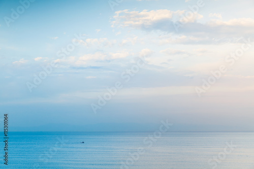 © evannovostro, Fototapeta premium Small boat goes on sea water, negative space
