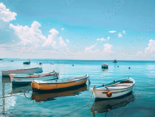 © koala studio, Naklejka premium Small boats bob gently in a calm sea