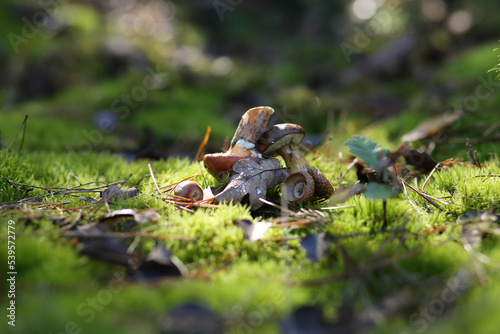© Ihor95, Obraz premium Small boletus along with acorns are on a wet green moss.