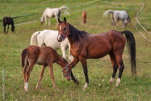 © Lubo Ivanko, Fototapeta premium Small brown Arabian horse foal standing next to his mother, blurred green grass field with more animals background