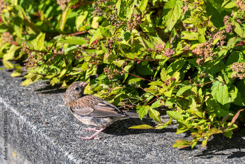 © knelson20, Naklejka premium Small brown bird perched on a cement wall in a garden