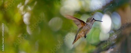 Obraz premium Small, brown bird with a long beak hovers in mid-air