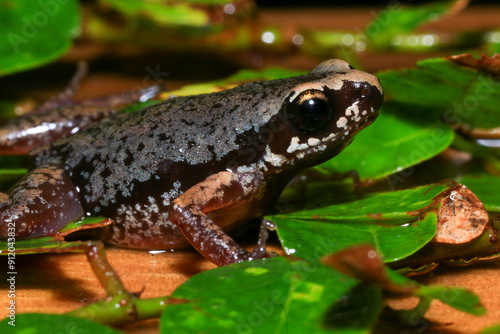 © Sigma s, Fototapeta premium Small brown frog on a green leaf in the rainforest