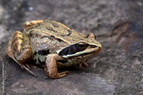© Marina, Fototapeta premium Small brown frog on grey rock. Wildlife conservation.