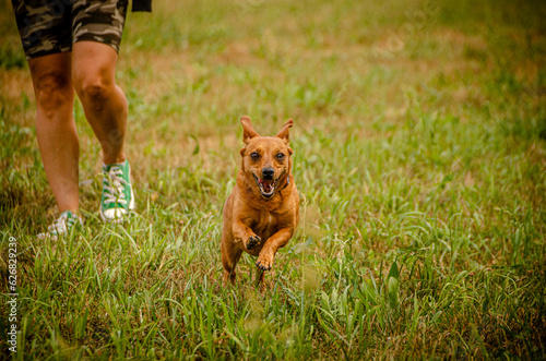 © Andrzej, Naklejka premium small brown happy dog playing and running with his female owner