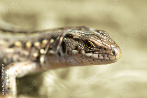 © Klochkov, Fototapeta premium Small brown lizard on a blurred background in macro