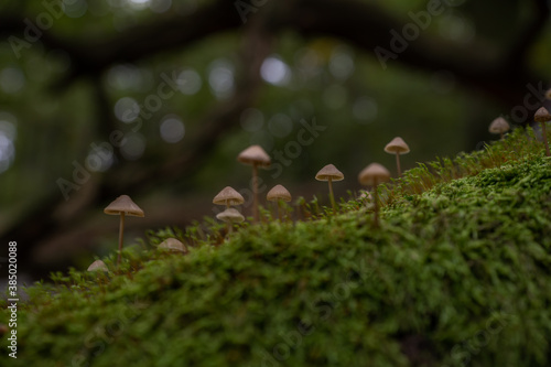 Obraz premium Small brown mushrooms grow from moss in the forest with a blurred background