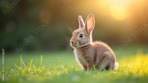 © DhanaStudio, Fototapeta premium Small brown rabbit in a meadow during golden hour, surrounded by warm evening light.