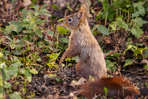 Fototapeta premium Small brown squirrel eating leaves
