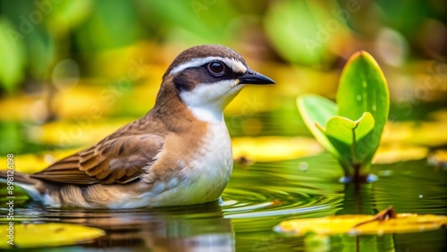 © Wanlop, Obraz premium Small brownish bird with distinctive black throat patch and whitish belly swimming in serene lake surrounded by lush vegetation ambiance.