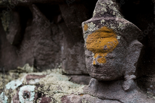 Fototapeta premium Small Buddha face carving adorned with coloured paste